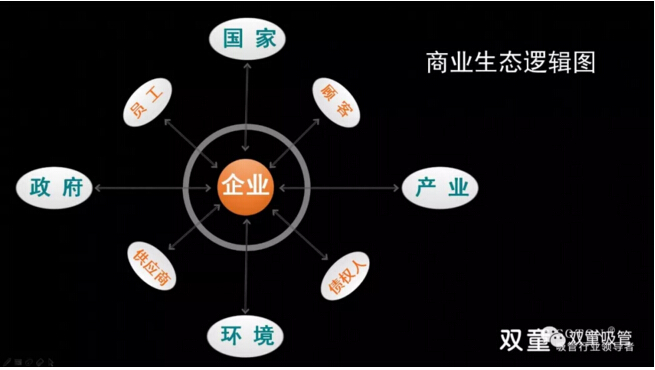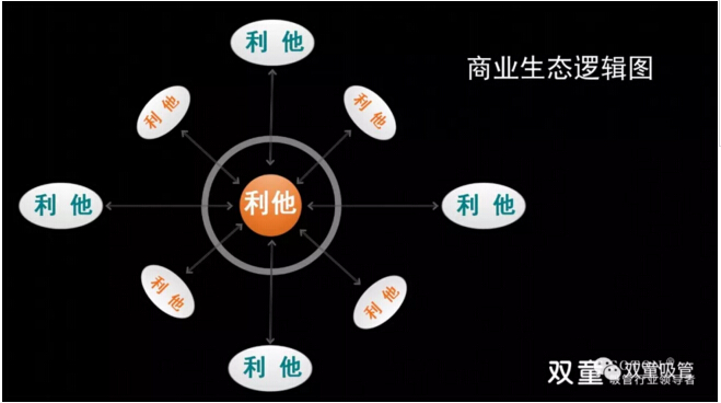 將“商業(yè)的本質(zhì)”與“人性”剖析清楚后,樓總將一幅商業(yè)生態(tài)邏輯圖展現在大家面前,抽絲剝繭地將商業(yè)邏輯完整地講解出來(lái):人與他人(天下萬(wàn)物)之間存在彼此交換的過(guò)程,你對員工的態(tài)度、對社會(huì )的態(tài)度、對環(huán)境的態(tài)度、對資源的態(tài)度、對他人的態(tài)度(包含競爭對手),換取了“他人”對你的態(tài)度,這也是利他的背后一定是利已的商業(yè)本質(zhì)!