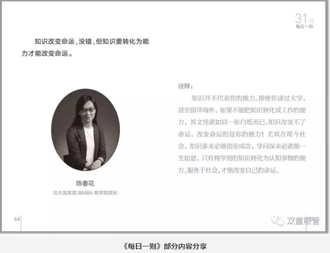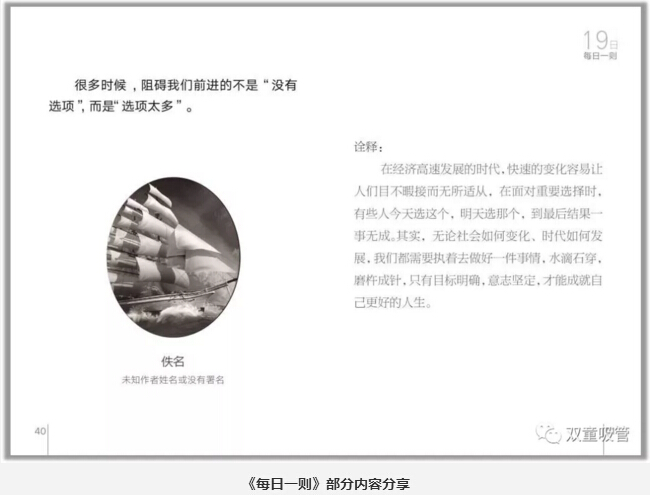 首先,就是晨讀環(huán)節。“雙童”所有員工在上班之前都會(huì )在統一時(shí)間誦讀“雙童”的企業(yè)文化叢書(shū)——《每日一則》。這本《每日一則》里,共收錄了31句名人經(jīng)典語(yǔ)錄,以月度為單位讓員工進(jìn)行重復誦讀,內容包含了專(zhuān)注、創(chuàng )新、共贏(yíng)、正氣等主題。這可是員工們從幾千條好句里挑出來(lái),并且自己解析的呢!