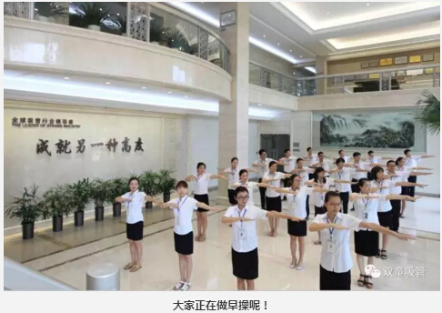 除了精神上要得到提升之外,我們的身體素質(zhì)也非常重要!每天,在晨讀環(huán)節結束之后,我們都會(huì )進(jìn)行早操活動(dòng)。俗話(huà)說(shuō),“一年之際在于春,一天之際在于晨”。在“雙童”行政大廳,員工們列隊整齊,精神飽滿(mǎn),氣宇軒昂,伴著(zhù)豪邁的音樂(lè ),用整齊劃一的動(dòng)作做起早操,形成了一道靚麗的風(fēng)景線(xiàn)。