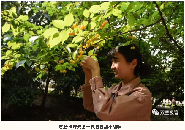 如此誘人的櫻桃,吃貨們當然待不住啦!吸管妞和吸管妹妹們作為“雙童”專(zhuān)業(yè)吃貨當然要先去幫大家嘗嘗味道啦!從樹(shù)上摘下櫻桃,直接丟進(jìn)嘴里,真是甜到了心坎里,忍不住吃了一顆又一顆,還有哪種新鮮比得上這樣現采品嘗呢!