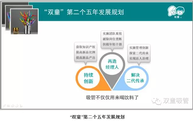 現在,公司有二三十個(gè)中高層,,平均工齡10年以上,年齡30歲左右,都是我一個(gè)個(gè)帶出來(lái)的,“雙童”做的吸管是一個(gè)比較偏門(mén)的行業(yè),沒(méi)有行業(yè)的通用性人才,所以我們基本不用空降兵。這批人是我帶出來(lái)的,就深受我的影響,在乎工作、可以放下身段,整體素質(zhì)遠超第一代管理者。這批第二代管理者培養起來(lái)后,至少打開(kāi)了“雙童”未來(lái)二十多年企業(yè)持續發(fā)展的窗口。