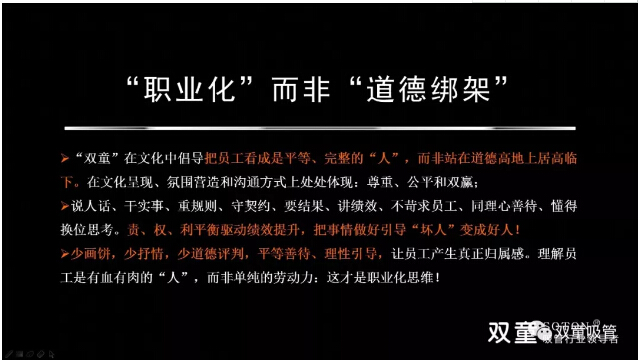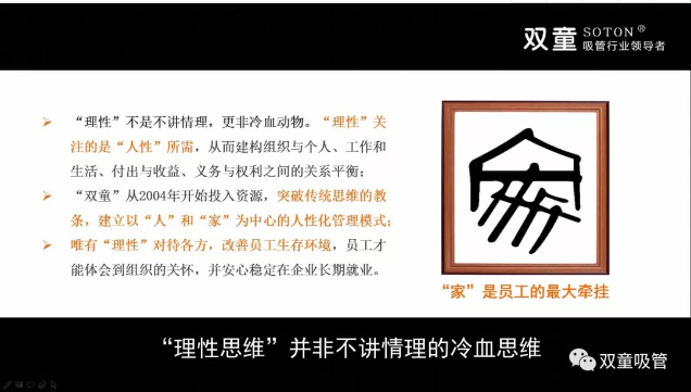 需要注意的是,所謂的“理性經(jīng)營(yíng)”絕非是不講情理,更非冷血動(dòng)物……“理性”關(guān)注的是“人性”所需,“雙童”建立以“人”和“家”為中心的人性化管理模式,“理性”地“善待員工”,實(shí)質(zhì)是引導員工“善待企業(yè)”。