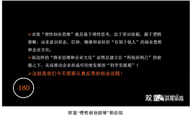 最后,樓仲平也對雙童“理性創(chuàng )業(yè)思維”進(jìn)行了總結:它就是基于理性思考,忠于常識依據,源于邏輯推斷,而非意識形態(tài)、信仰、情緒和喜好的“有別于他人”的商業(yè)思維和企業(yè)文化;而這樣的“商業(yè)思維和企業(yè)文化”必然是建立在“利他而利己”的前提之下,從而推動(dòng)企業(yè)形成可持續發(fā)展的“科學(xué)發(fā)展觀(guān)”!