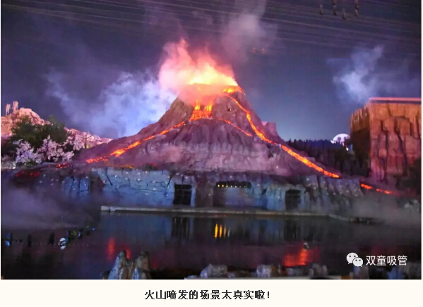 到了晚上7點(diǎn)30分,精彩的表演開(kāi)始了!高35米的火山在漆黑的夜幕中突然爆發(fā),熱浪沖天,火山熔巖漿滾滾而下…… 整個(gè)演出使用了激光高科技,將水面和空中演繹的若夢(mèng)若幻,美輪美奐,讓大家震撼到贊不絕口!