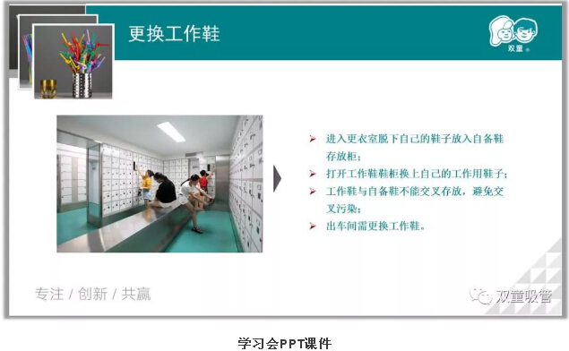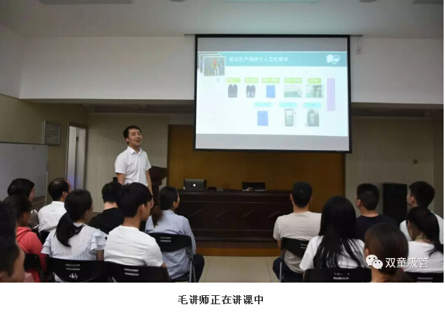 于是,毛講師和大家說(shuō)明了原因:吸管是食品接觸類(lèi)的產(chǎn)品,所以一定要保證產(chǎn)品的衛生。唯有整潔的工廠(chǎng)才能生產(chǎn)出高品質(zhì)的產(chǎn)品。所以,早在2003年,“雙童”就一次性投入上億資金,建設了“GMP”食品標準的生產(chǎn)廠(chǎng)房,以保障公司所有廠(chǎng)區的衛生與整潔,并促使所有員工的整體素質(zhì)不斷提升!
