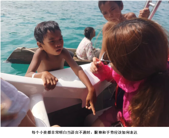 當我們的快艇一放慢速度,我們就發(fā)現許多小船便快速朝著(zhù)我們前進(jìn),說(shuō)實(shí)話(huà)心里還是很恐慌的。當船慢慢靠近了以后發(fā)現,船上基本上是老人、婦人,最多的是小孩,他們曬得黝黑黝黑的,女孩子臉上還涂著(zhù)黃白色的泥巴,睜著(zhù)大大的眼睛,不斷地用目光搜尋你身上有沒(méi)有他們想要的食物。一旦發(fā)現,就賴(lài)著(zhù)你,用央求的眼神可憐巴巴地指著(zhù)食物,希望你可以把食物分享給他們。我們翻遍了包包,只找到一罐口香糖。姐姐拿出一顆想給一個(gè)小女孩,那個(gè)小女孩竟然搖搖頭,指著(zhù)那個(gè)罐子表示她想要一罐??紤]到不確定他們能夠明白口香糖是要吐掉的,我們就拒絕了她的要求。小女孩也不生氣,央求了一段時(shí)間后,便轉移目標,指了指姐姐頭上戴著(zhù)的花,想讓我們把花也給她。這怎么行,我們也只有一朵,還是買(mǎi)泳衣的時(shí)候送的,后續大家可以看到這朵花不斷地出現在我和姐姐的頭上,發(fā)揮了卓越的裝飾作用……捂臉。