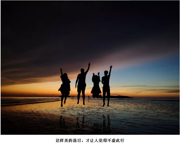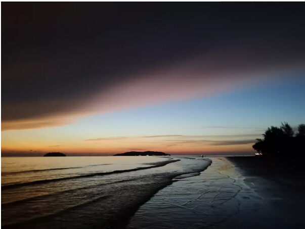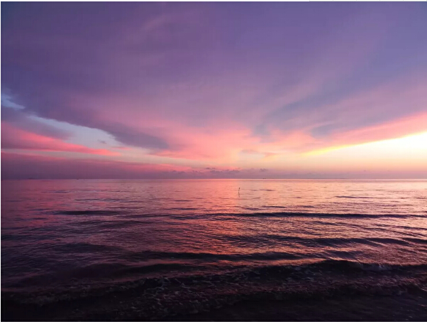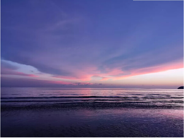 到了太陽(yáng)快下山時(shí),我們也回到了沙灘上。只見(jiàn)一輪紅日慢慢向山那邊落下去,云彩也被映襯得金黃金黃的,倒映在水中的光也讓人頭暈目眩,睜不開(kāi)眼。沒(méi)幾分鐘,太陽(yáng)就下山了。就當我們覺(jué)得“世界上最美的落日”也就是不過(guò)如此時(shí),神奇的事發(fā)生了!太陽(yáng)下山以后,刺眼的光芒也不見(jiàn)了,而留下來(lái)的云朵開(kāi)始了他們的表演,演變成了黃色、藍色、紫色,不斷變幻,像是打翻了顏料盤(pán)后幾種顏色混到了一起。瑰麗的云層壓得很低,似乎和大海連到了一起,海天一色。此情此景,讓每個(gè)人的心都變得柔軟起來(lái)。此時(shí)此刻,無(wú)語(yǔ)也溫暖,平凡也浪漫。