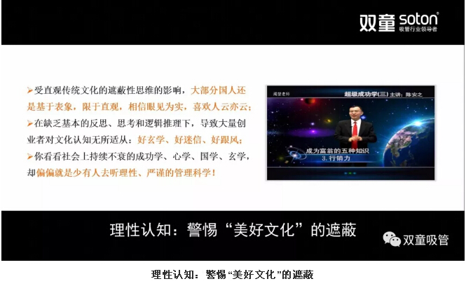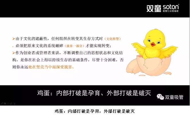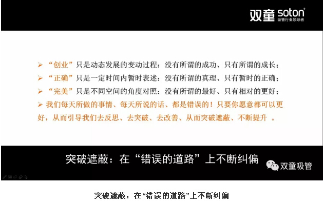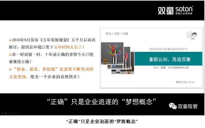 “雙童”在五年發(fā)展規劃中也是基于不斷的改變。樓仲平深知組織文化的初期一定是為企業(yè)服務(wù)的,一旦成型之后一定程度上封閉了組織思維的進(jìn)一步開(kāi)放,因此企業(yè)在每個(gè)階段都需要去突破。“雙童”從2005年開(kāi)始,每五年發(fā)布一個(gè)五年發(fā)展規劃。2016年9月,“雙童”發(fā)布的《五年發(fā)展規劃》五個(gè)月后再次修訂,原因是環(huán)境巨變下五年時(shí)間太長(cháng)了!此一時(shí)而彼一時(shí),十年前正確的事情今天已絕難繼續正確!“使命、愿景、價(jià)值觀(guān)”是需要不斷變動(dòng)的文化變體,絕非一個(gè)企業(yè)的真理所在!