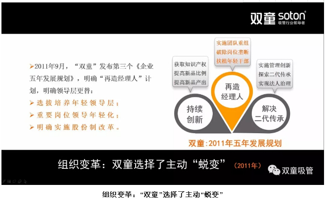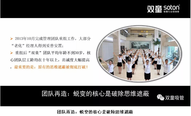 因此,“雙童”選擇了主動(dòng)“蛻變”,公司在2011年發(fā)布了第三個(gè)《企業(yè)五年發(fā)展規劃》,明確“再造經(jīng)理人”計劃,明確領(lǐng)導層更替:選拔培養年輕領(lǐng)導層、重要崗位領(lǐng)導年輕化、明確實(shí)施股份制改革,慢慢解決管理層老化問(wèn)題!2013年10月,“雙童”完成管理團隊重組工作,大部分“老化”經(jīng)理人得到妥善安置。重組后“雙童”團隊平均年齡不到30歲,核心團隊層工齡均在十年以上,忠誠度大幅提高,最重要的是:原有的思維遮蔽被徹底打破!