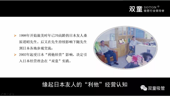1998年,“雙童”樓仲平通過(guò)業(yè)務(wù)關(guān)系結識了一位旅美日本友人桑原道昭先生。桑原道昭先生在美國待了45年,會(huì )一點(diǎn)漢語(yǔ)。他會(huì )和樓仲平交流做生意的看法,并用日本人的視角和思想解讀節能環(huán)保、節約土地、員工關(guān)懷等方面的話(huà)題。在交流過(guò)程中,32歲的樓仲平與當時(shí)已經(jīng)70歲高齡的桑原道昭先生成為了忘年交,此后便開(kāi)啟了樓仲平不斷去日本參觀(guān)的學(xué)習之旅。在看過(guò)無(wú)數日本企業(yè)對自然環(huán)境、資源循環(huán)利用等方面的做法后,日本“利他”經(jīng)營(yíng)的管理理念深深影響了樓仲平的商業(yè)思維。于是,當2003年新建廠(chǎng)房的機會(huì )來(lái)臨,樓仲平便立志要將“雙童”建設為一個(gè)生態(tài)、環(huán)保、無(wú)污染、無(wú)排放的花園式工廠(chǎng)。