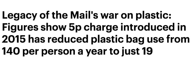 “根據數據顯示,自2015年推出對每個(gè)塑料袋征收5便士(約4.5毛)稅款法案后,英國的塑料袋使用量從人均每年140個(gè)降至19個(gè)!”