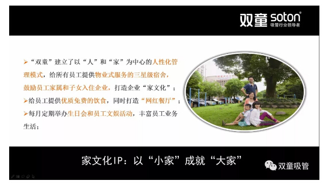 “雙童”建立了以“人”和“家”為中心的人性化管理模式,給所有員工提供物業(yè)式服務(wù)的三星級宿舍、提供優(yōu)質(zhì)餐飲并舉辦豐富多彩的文化活動(dòng),鼓勵員工家屬和子女入住企業(yè),打造企業(yè)“家文化”!在這過(guò)程中,我們也挖掘了不少家文化的“故事”,讓這些故事通過(guò)自媒體得到了很好的傳播,引發(fā)了不少媒體大眾的關(guān)注!