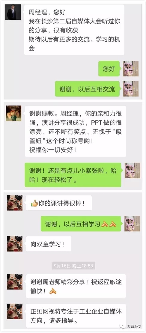 課程結束后,不少聽(tīng)眾也主動(dòng)添加了吸管妞的微信,并表示了贊許和認同??磥?lái),吸管妞也是“小火”了一把喲!接下來(lái),“雙童”文宣科也將繼續努力,將“雙童”的品牌和文化傳播得更遠!