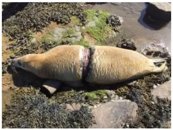 英國海邊,躺著(zhù)一只奄奄一息的海豹,塑料環(huán)直接勒進(jìn)了肉里。