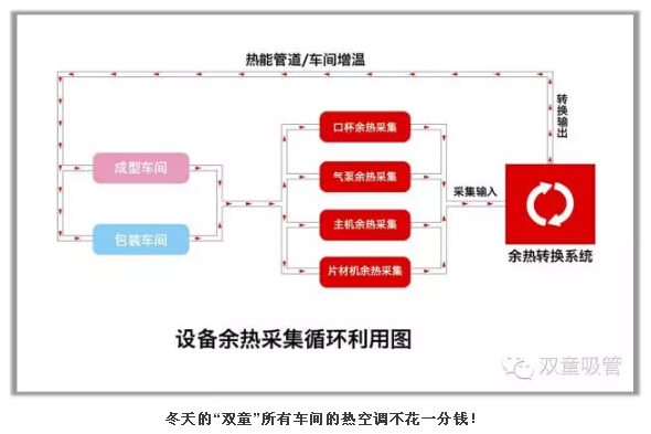“雙童”對所有經(jīng)過(guò)模具的50度溫水進(jìn)行收集,處理之后供應到所有寢室衛生間給員工洗澡洗衣生活之用。同時(shí),“雙童”對所有生產(chǎn)設備的余熱和廢氣進(jìn)行采集并回收,再通過(guò)空調管道輸送到需要加溫的各個(gè)車(chē)間和工段。通過(guò)上述方式,“雙童”光是在余熱水采集和設備余熱采集方面,每年就節省了150多萬(wàn)元,消滅了企業(yè)產(chǎn)生的污染和排放!