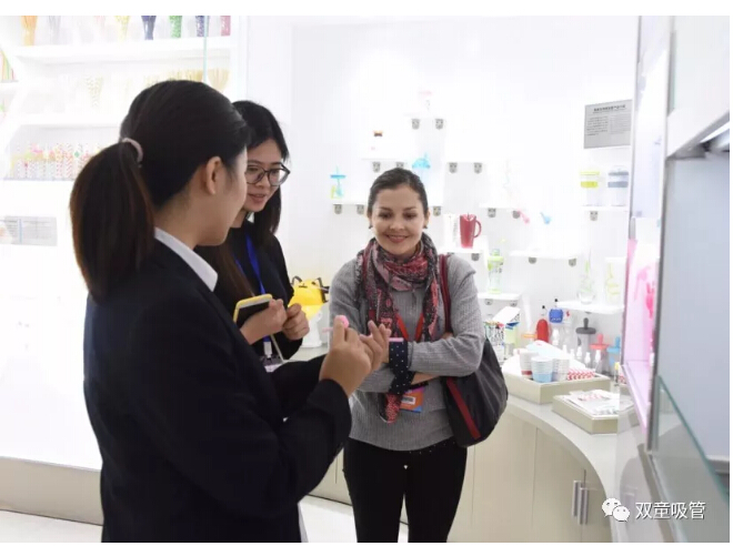 接著(zhù),卡林納女士被“雙童”創(chuàng )新產(chǎn)品體驗區的產(chǎn)品吸引住了,在聽(tīng)了吸管妞對卡通吸管、小鳥(niǎo)吸管、眼鏡吸管、愛(ài)心吸管、哈哈吸管的一番介紹后,她也是覺(jué)得十分的不可思議,一根吸管竟能玩出這么多的花樣!