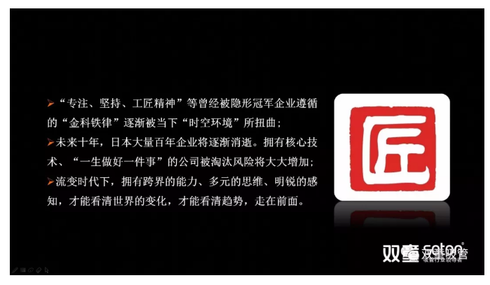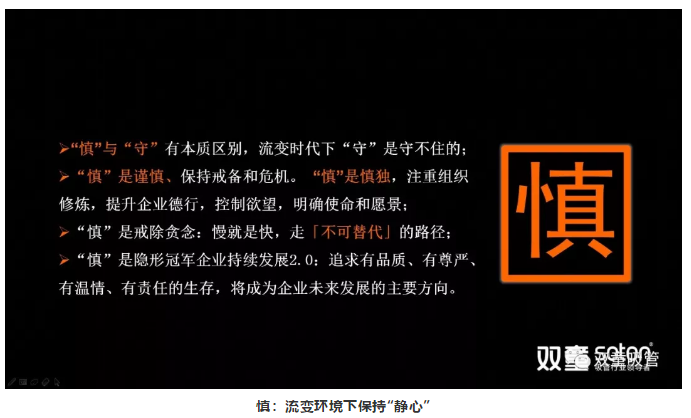 第一個(gè)字是“慎”,謹慎的“慎”。對于今天站在行業(yè)領(lǐng)先的隱形冠軍來(lái)講,“慎”可能是一個(gè)內修內練的過(guò)程。