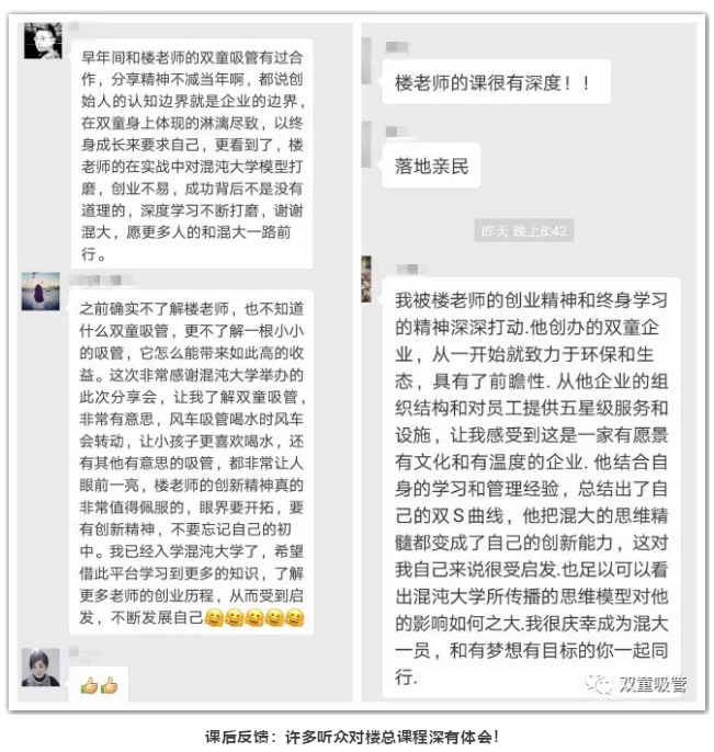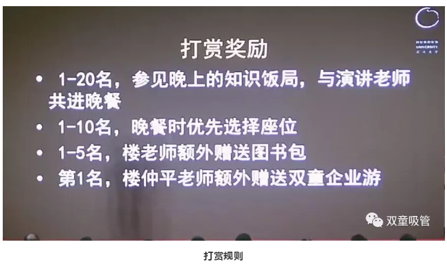 不知不覺(jué)分享也到了尾聲,在場(chǎng)聽(tīng)眾卻依舊意猶未盡,空前的學(xué)習氛圍,讓每一個(gè)人都沉浸在這場(chǎng)思維的盛宴中!在樓仲平分享之后,同學(xué)們開(kāi)啟了瘋狂打賞模式,想與樓總有進(jìn)一步交流。晚上的知識飯局,樓仲平則成了“香餑餑”,成為了大家爭先交流的對象。