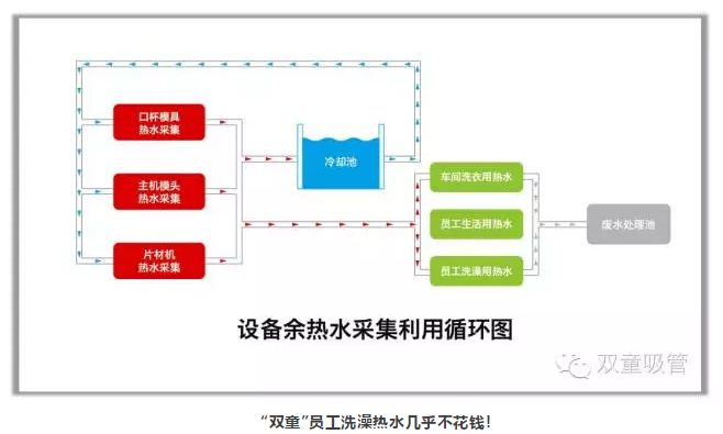 設備余熱水循環(huán)系統通過(guò)對車(chē)間內所有經(jīng)過(guò)模具的50度溫水進(jìn)行收集,處理之后供應到所有寢室衛生間給員工洗澡洗衣生活之用,從而高效利用了余熱能源,另一方面,也讓員工們隨時(shí)都能用上熱水!