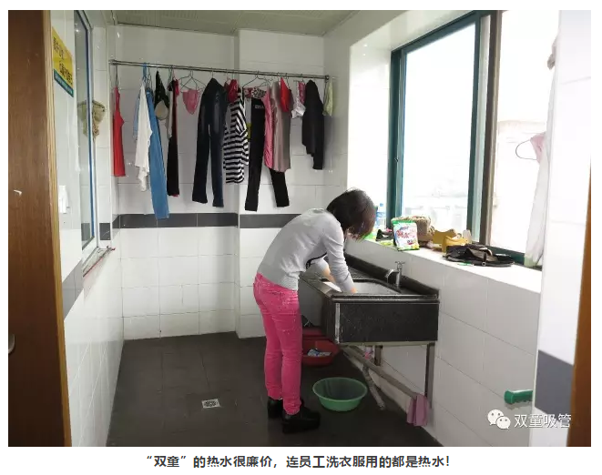 2004年,“雙童”實(shí)施了余熱水采集利用之后,解決了員工洗澡等生活所用熱水的問(wèn)題,徹底消滅了原來(lái)鍋爐燒煤供水的污染。