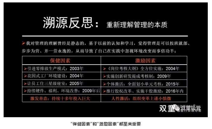 “雙童”樓仲平也曾在學(xué)習會(huì )上談到,員工與組織的關(guān)系就是一種彼此交換、彼此協(xié)作、彼此默契、彼此期望的雇傭關(guān)系,所以本質(zhì)上就無(wú)法像對待“家人”一樣對待員工,否則就會(huì )出現雙方彼此期待的背離,從而給雙方帶來(lái)傷害。