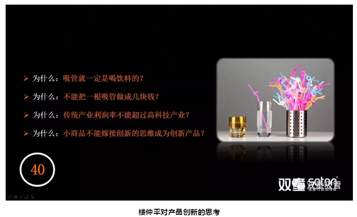 吸管在傳統認知中是典型的“低、小、散、弱”的小商品!但樓仲平偏偏不信這個(gè)邪,從2003年之后,他逐漸開(kāi)始“不務(wù)正業(yè)”思考“產(chǎn)品 Vs 商品”的關(guān)系,從而引發(fā)思考: