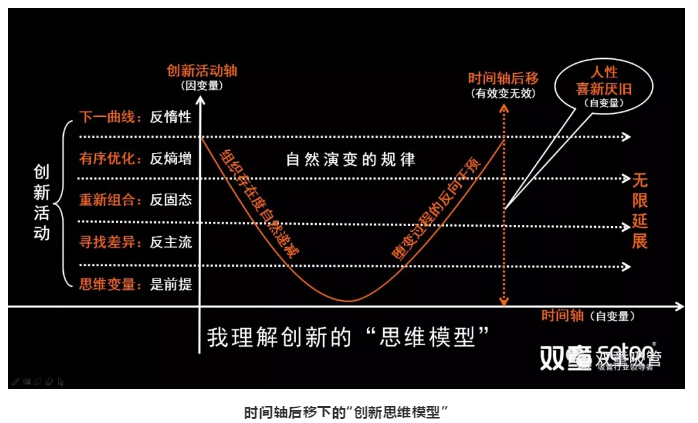 基于對“喜新厭舊”的理解,我們可以推導出隨著(zhù)時(shí)間流逝,昨天還是“創(chuàng )新”的東西,今天就未必還“新”。所以,“創(chuàng )新”是有“時(shí)間軸”的,隨著(zhù)“時(shí)間軸”不斷后移,原有的“創(chuàng )新”有效變成了無(wú)效,創(chuàng )新活動(dòng)也就“無(wú)窮無(wú)盡”!