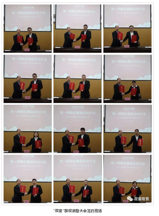 經(jīng)過(guò)八年的探索,經(jīng)過(guò)泰山管理學(xué)院對“雙童”股權激勵工作的支持和指導,2018年12月19日,雙童吸管第一期股權激勵啟動(dòng)大會(huì )隆重舉行!“雙童”首批12位核心員工真正成為企業(yè)合伙人!