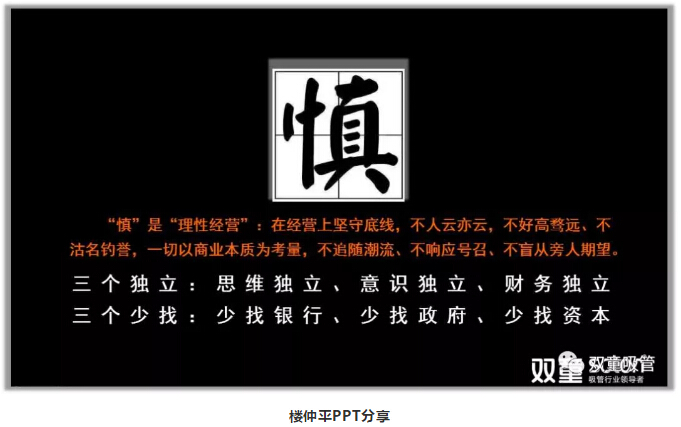“慎”也是科學(xué)管理的本真,我們要有自己獨立的意識,要有自己獨立的思維,在經(jīng)營(yíng)上要有自己的獨立判斷,堅守底線(xiàn),不人云亦云,一切以商業(yè)本質(zhì)為考量,不追隨潮流、不響應號召、不盲從旁人期望?;谝陨?,樓仲平也總結出“三個(gè)獨立”和“三個(gè)少找”: