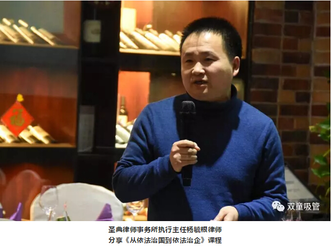 年會(huì )中的下一項議程,是由圣典律師事務(wù)所執行主任楊毓根律師分享《從依法治國到依法治企》,楊毓根律師首先也和大家分享了從法律角度對“慎”字的理解,并結合事例向大家分享了為何要推動(dòng)依法治國和依法治企,以及依法治企的重要性!