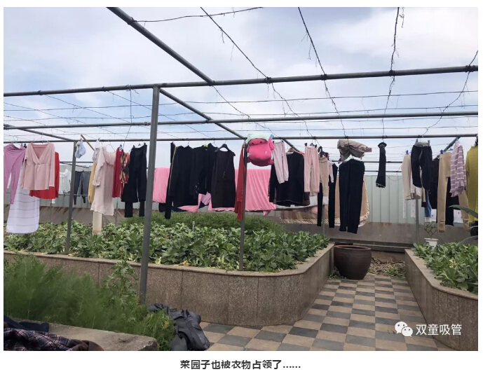 瞧!“雙童”人捂了一個(gè)月的衣物、被子曬滿(mǎn)了晾衣平臺!就連平時(shí)空著(zhù)的屋頂菜園都被占領(lǐng)的滿(mǎn)滿(mǎn)當當的,和綠油油的蔬菜交相輝映……