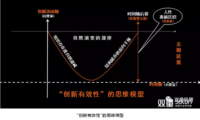再通過(guò)進(jìn)一步的推導,可以得出一個(gè)創(chuàng )新思維模型:組織作為萬(wàn)物當中的組成部分,在自然演變的過(guò)程當中組織存在“自然遞減”。為了保證組織持續存在,就需要不斷地調整和干預,從而延緩組織存在度發(fā)生“自然遞減”的墮變現象,保持組織活力!