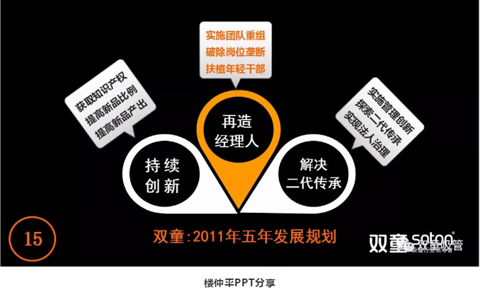 對于傳承問(wèn)題,在2011年,“雙童”明確了子女不走接班權,而是要讓核心員工持股,將所有權和經(jīng)營(yíng)權分離。而在2018年的12月19日,在“雙童”第一期股權激勵啟動(dòng)大會(huì )上,“雙童”首批12位核心員工正式簽約成為“雙童”的經(jīng)營(yíng)伙伴,我們以股份合伙、業(yè)務(wù)合伙等“合伙激勵”的 方式讓優(yōu)秀人才變?yōu)楹匣锶?,讓員工和組織的目標長(cháng)遠契合、共同生長(cháng)、共享價(jià)值創(chuàng )造的有效延伸!