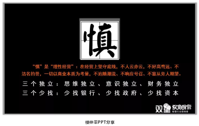 答:在流變時(shí)代下,企業(yè)要很好的“活著(zhù)”,要有品質(zhì)、有尊嚴、有溫情、有責任、可持續發(fā)展,首先要具備的就是“慎”。在經(jīng)營(yíng)上要有自己的獨立判斷,堅守底線(xiàn),不人云亦云,一切以商業(yè)本質(zhì)為考量,不追隨潮流、不響應號召、不盲從旁人期望?;谝陨?,樓仲平也總結出“三個(gè)獨立”和“三個(gè)少找”: