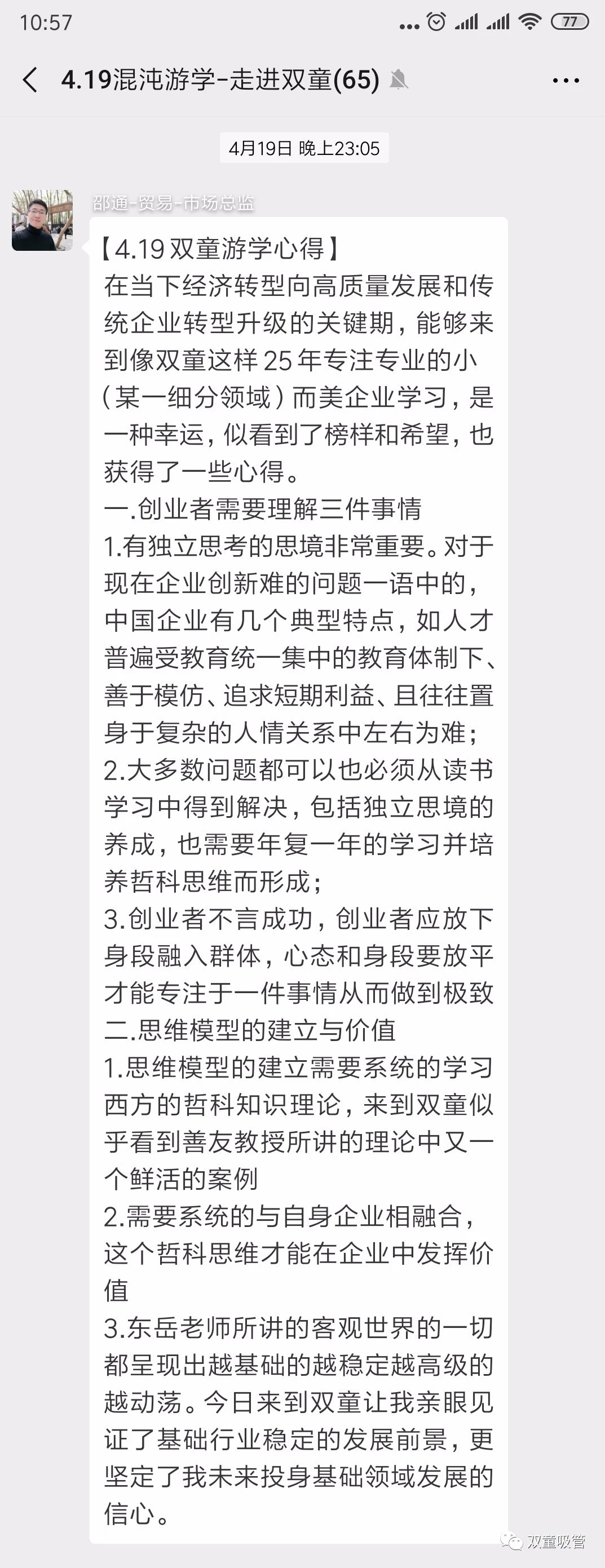 最后,也感謝混沌大學(xué)的同學(xué)們能夠如此認真和熱情地參與到此次游學(xué)活動(dòng)中來(lái),歡迎大家下次再來(lái)“雙童”做客哦!