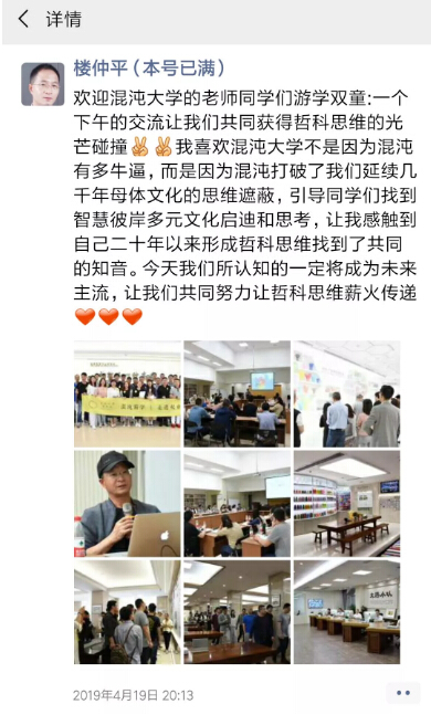 樓仲平也在朋友圈里分享了當天的感想,希望能和混沌大學(xué)的同學(xué)們共同努力,讓哲科思維薪火傳遞!