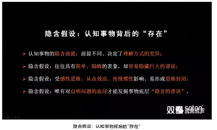 首先,樓仲平引導大家認知事物背后存在的“隱含假設”,假設是通過(guò)想象可能存在的假說(shuō),隱含假設是認知事物的基礎前提,容易受感性思維和傳統慣性影響,形成思維封閉。