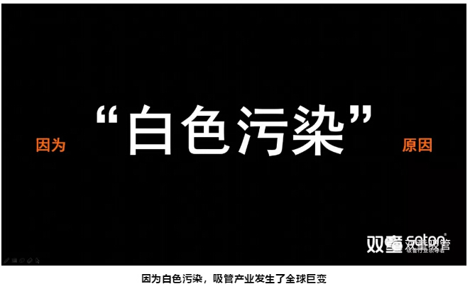 首先,樓仲平用一組精美的產(chǎn)品圖片向大家展示了“雙童”各式各樣的創(chuàng )新吸管,打破了大家認為吸管是“低、小、散、弱”小商品的傳統認知。而當大家都還沉浸在吸管還可以有這么多花樣的認知時(shí),樓仲平卻話(huà)鋒一轉,向大家說(shuō)明:“看起來(lái)很美的吸管產(chǎn)業(yè)突然有一天發(fā)生了全球巨變!”