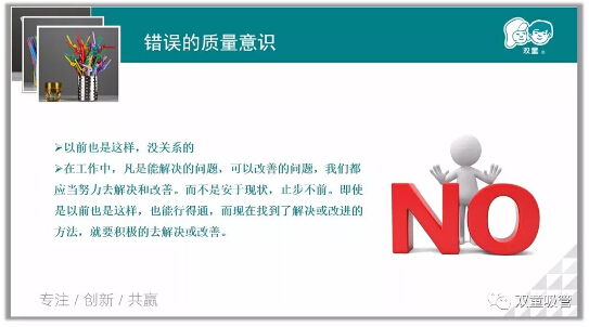 最重要的,就是樹(shù)立正確的質(zhì)量意識。在工作中,凡是能解決的問(wèn)題,可以改善的問(wèn)題,我們都應當努力去解決和改善,而不是安于現狀,止步不前。即使是以前也這樣能行得通,但現在找到了解決或改進(jìn)的方法,就要積極的去解決或改善。