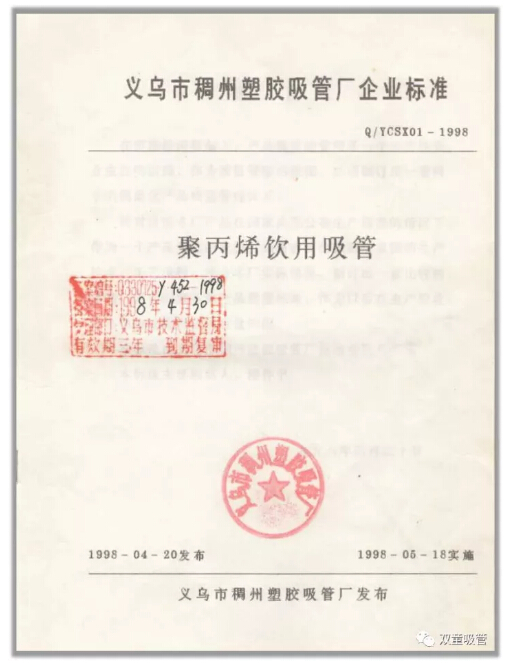 終于,在1997年10月,由“雙童”前身義烏市稠州塑膠吸管廠(chǎng)起草的Q/YCSX01《聚丙烯飲用吸管》企業(yè)標準審核通過(guò),于1998年4月正式發(fā)布,成為吸管行業(yè)最早的產(chǎn)品標準。這也讓“雙童”踏出吸管行業(yè)標準制定的第一步!