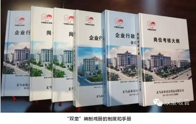 1997年開(kāi)始,“雙童”從最簡(jiǎn)單的制度規范入手,逐步深入到行政、后勤、生產(chǎn)、銷(xiāo)售、財務(wù)等十多個(gè)板塊的行政管理手冊,從而逐漸形成了企業(yè)制度化工作的標準化和規范化,推動(dòng)企業(yè)從“人治”到“法治”轉變。