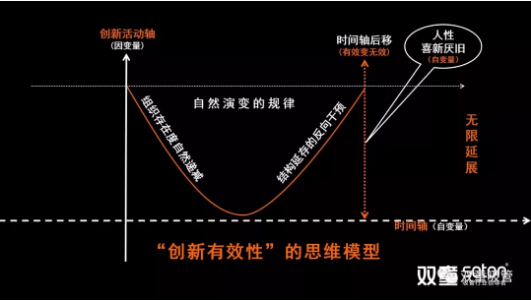 這是“創(chuàng )新有效性”思維模型。從圖中我們能看到:時(shí)間軸后移下,創(chuàng )新的有效變無(wú)效,從而導致組織創(chuàng )新工作變得無(wú)窮無(wú)盡。