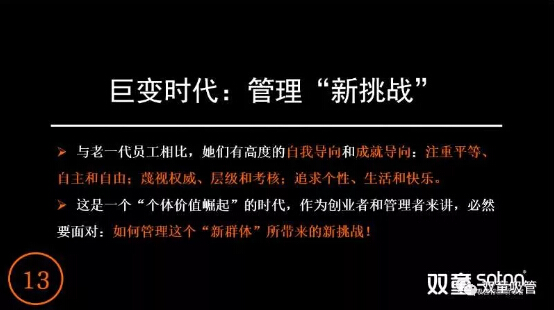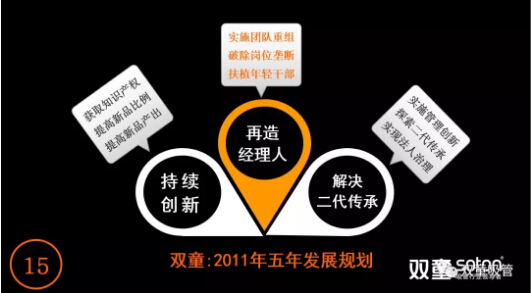 答:“雙童”去年12月19日做了第一期股改。《載入“雙童”史冊!第一期股權激勵大會(huì )隆重召開(kāi),這12位新晉“雙童”股東到底是什么來(lái)頭?(點(diǎn)擊閱讀)》核心團隊的12位員工成為了股東,但我們還是堅持暫時(shí)不上市,因為中國的資本市場(chǎng)是政策市和領(lǐng)導市,對于雙童這樣中小企業(yè)是經(jīng)不起折騰的,當然留住人才并非只是股改。以下是我另外一堂關(guān)于人事管理的課程分享。