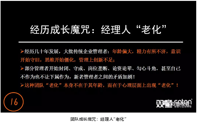 以“雙童”為例:在公司創(chuàng )辦初期聘用的一批管理層,在2010年前后,大部分管理人員逐漸出現:依托于慣性思維,憑經(jīng)驗用老方法解決新問(wèn)題,不愿意學(xué)習等問(wèn)題,團隊的成長(cháng)也因此遇到了瓶頸。