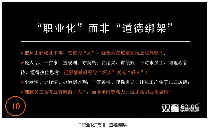 與此同時(shí),我們也要理解員工是有血有肉的“人”,而非單純的勞動(dòng)力,對待員工少“畫(huà)餅”,少抒情,懂得換位思考,不去“道德綁架”員工,讓員工真正產(chǎn)生歸屬感。