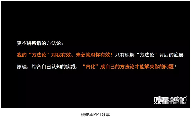 同時(shí),方法論還存在一個(gè)“時(shí)間軸”,隨著(zhù)時(shí)間軸的后移,以前的方法論到今天要么效率降低,要么完全失效!在這個(gè)過(guò)程中,作為創(chuàng )業(yè)者或經(jīng)營(yíng)者要理解“方法論”背后的底層原理,結合自己認知的實(shí)踐,“內化”成自己的方法論才能解決你所遇到的問(wèn)題!
