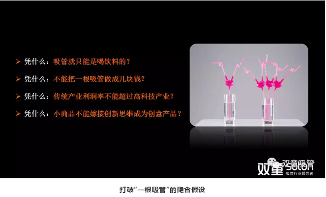 答:在生活中,許多人都容易陷入自身的“隱含假設”中,認為吸管這類(lèi)產(chǎn)品就是“低、小、散、弱”,“雙童”卻在2005年提出:吸管不僅僅是用來(lái)喝飲料的,這一個(gè)認知就打破了“吸管只是用來(lái)喝飲料”這個(gè)“隱含假設”。