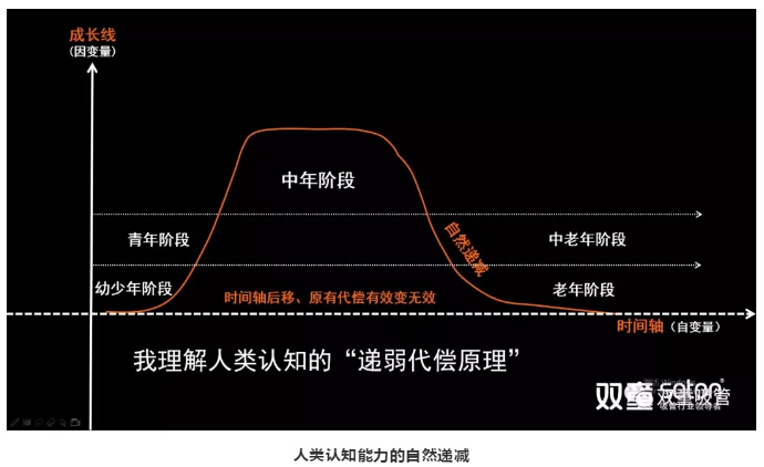 這個(gè)過(guò)程當中,我用一個(gè)“認知能力”思維模型給大家說(shuō)明:人類(lèi)發(fā)展中的成長(cháng)性是能夠無(wú)窮拓展的。比如正常來(lái)講,看一個(gè)人的認知能力,從幼年、少年、青年,到中年處于一個(gè)鼎盛階段,到中老年階段之后就進(jìn)入到自然遞減的過(guò)程。這是一個(gè)自然規律,這個(gè)規律不是人類(lèi)的自然規律,而是宇宙萬(wàn)物的規律。