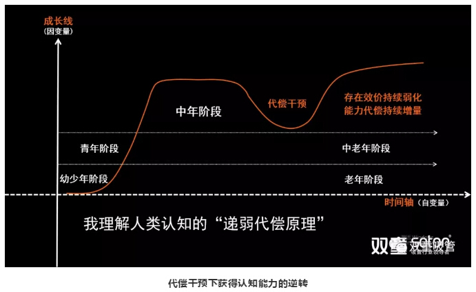 那有沒(méi)有辦法改變呢?我們可以通過(guò)持續不斷學(xué)習,開(kāi)放、交流,來(lái)獲得外部世界的信息,作為我們的代償能力干預,從而逆轉自然規律下的認知能力遞減,從而實(shí)現對認知能力自然規律的反向干預。