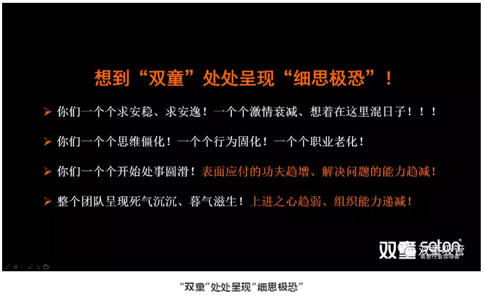或許,大家覺(jué)得“雙童”發(fā)展的很好,為什么會(huì )“死”?為什么離“死亡”只有六個(gè)月?為什么時(shí)隔七年(2011年,“雙童”推動(dòng)經(jīng)理人再造重大變革)再次推動(dòng)企業(yè)重大改革?